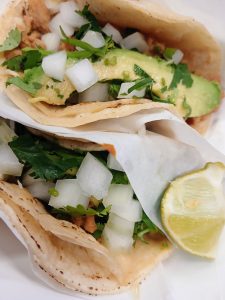 - Tacos vibrantes — seasoned, fried soy curls with onion, avocado, lime and salsa